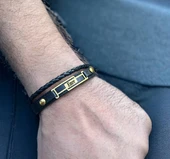 14 Ayar Altın Plakalı İsme Özel Çerçeveli Dikdörtgen Figürlü Hakiki Siyah Derili Hediye Bileklik-591