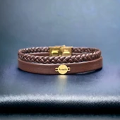 14 Ayar Altın Plakalı İsme Özel Yuvarlak Figürlü Hakiki Kahverengi Derili Hediye Bileklik-538