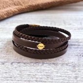 14 Ayar Altın Plakalı İsme Özel Yuvarlak Motifli Hakiki Kahverengi Derili Hediye Bileklik-533