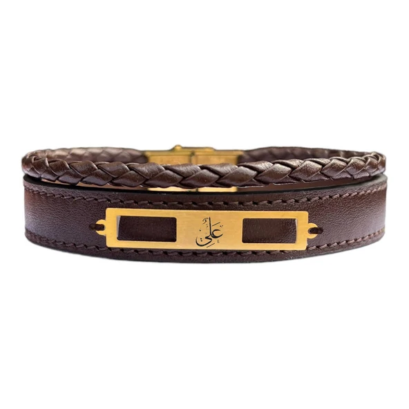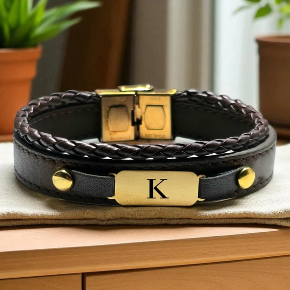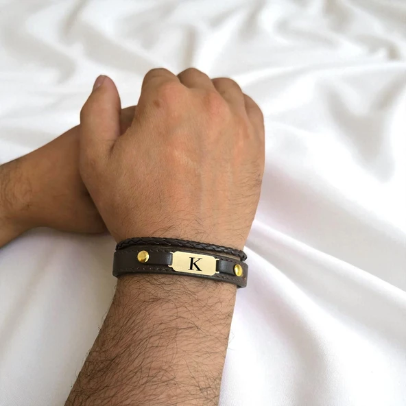 Harfe Özel 14 Ayar Altın Plakalı Dikdörtgen Motifli Hakiki Kahverengi Derili Hediye Bileklik-379