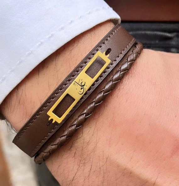 14 Ayar Altın Plakalı Sembole Özel Hakiki Kahverengi Derili Dikdörtgen Motifli Hediye Bileklik-532