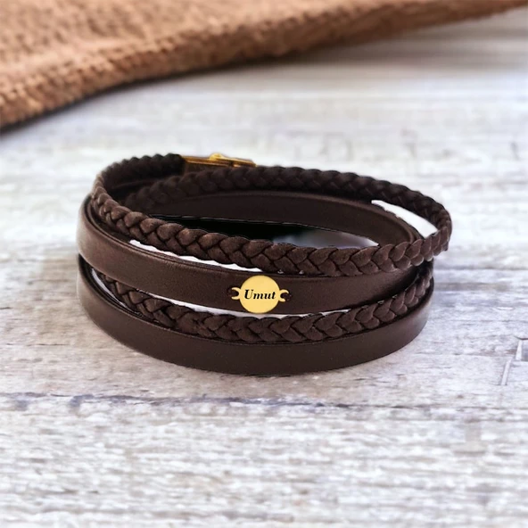 14 Ayar Altın Plakalı İsme Özel Yuvarlak Figürlü Hakiki Kahverengi Derili Hediye Bileklik-538
