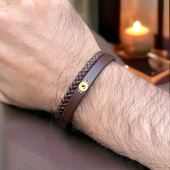 14 Ayar Altın Plakalı Harfe Özel Hakiki Kahverengi Derili Yuvarlak Figürlü Hediye Bileklik-538