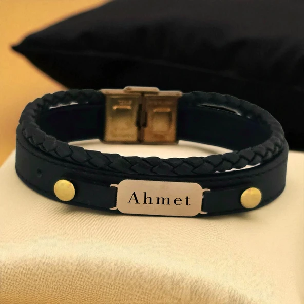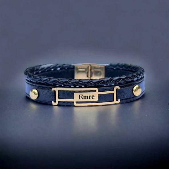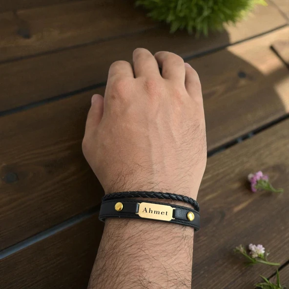 14 Ayar Altın Plakalı İsme Özel Çerçeveli Dikdörtgen Figürlü Hakiki Siyah Derili Hediye Bileklik-591