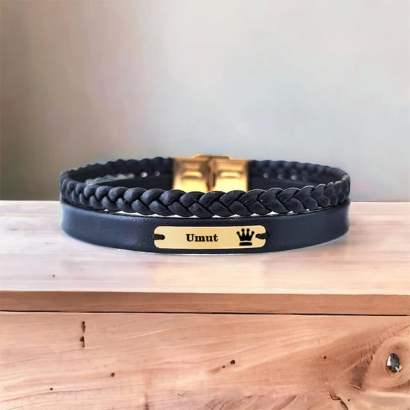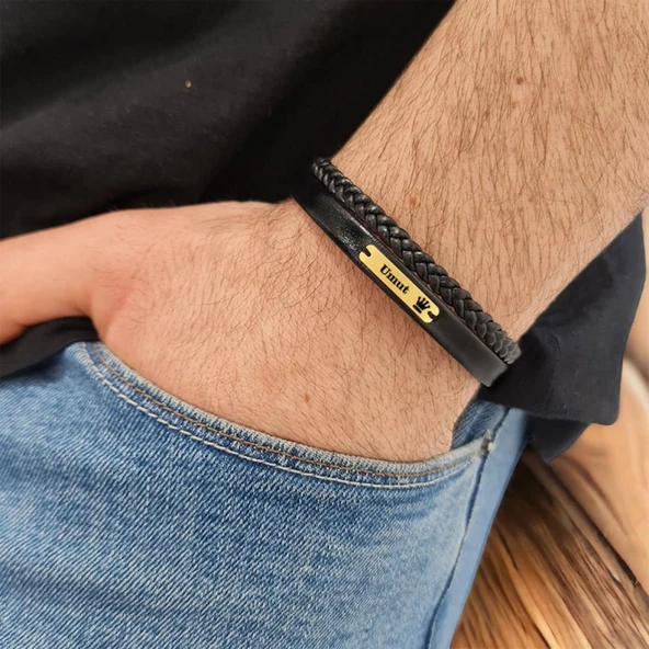14 Ayar Altın Plakalı İsme Özel Taç Motifli Hakiki Siyah Derili Hediye Bileklik-580