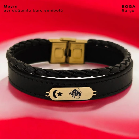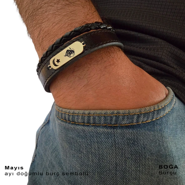 14 Ayar Altın Plakalı Burca Özel Hakiki Siyah Derili Ay Yıldız Motifli Hediye Bileklik-612