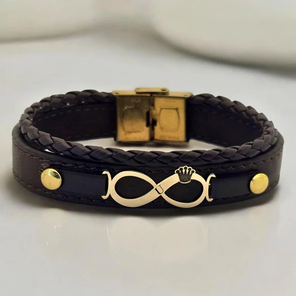 14 Ayar Altın Plakalı Harfe Özel Hakiki Kahverengi Derili Taç Detaylı Sonsuzluk Motifli Hediye Bileklik-614