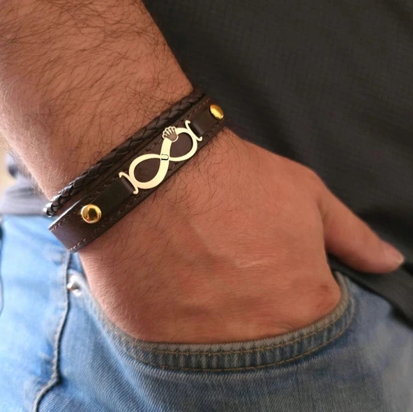 Sonsuzluk Motifli Hakiki Siyah Derili 14 Ayar Altın Plakalı Erkeklere Özel Hediye Bileklik-389