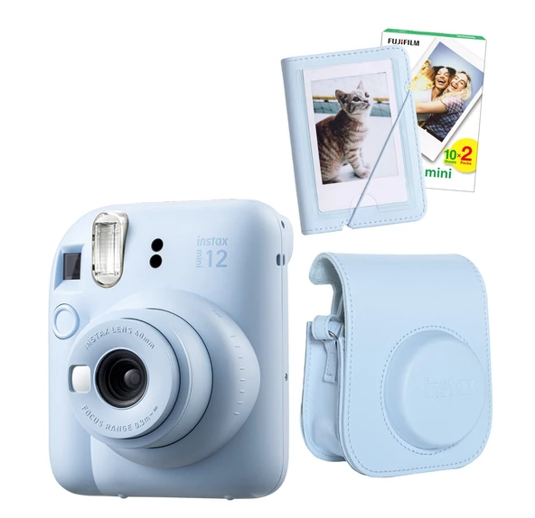 Fujifilm Instax Mini 12 20 Filmli Mini Albüm ve Deri Kılıflı Mavi Fotoğraf Makinesi