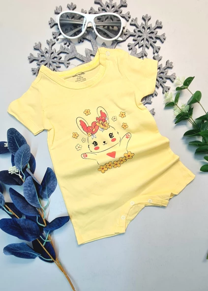 Bebek Yazlık Kısa Kol Şort Tek Parça Çıtçıtlı Tulum Zıbın %100 Pamuk Sarı Çiçekli