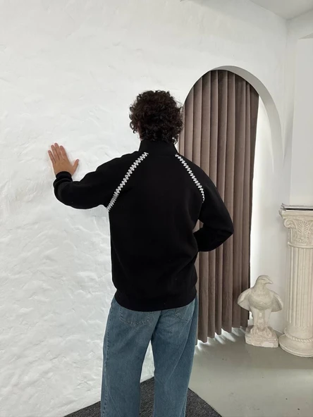 Erkek Oversize Dik Yaka Fermuarlı Sweatshirt - Zincir Nakışli Kanguru Cepli - Siyah