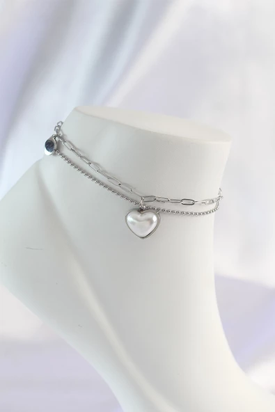 316L Çelik Gümüş Renk Beyaz Kalpli 2li Halhal - TJ-HH1585