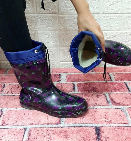 Çağrı Mor Çiçekli Siyah İçi Yünlü Kar Yağmur Çizmesi