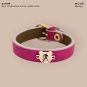 Burca Özel Ayıcık Motifli Doğal Pembe Derili 14 Ayar Altın Plakalı Hediye Bileklik-458