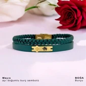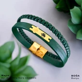 Burca Özel Çiçek Figürlü Doğal Yeşil Derili 14 Ayar Altın Plakalı Hediye Bileklik-452
