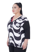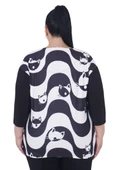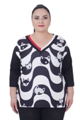 Büyük Beden Kedi Desenli V Yaka Kapri Kol Bluz