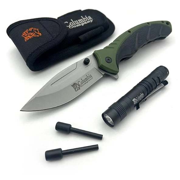 - Columbia Company FST-3070-B Kamp Bıçağı Seti, Çakı, Fener ve Ateşleyici Magnezyum Çubuğu Üçü Bir Arada Yeşil