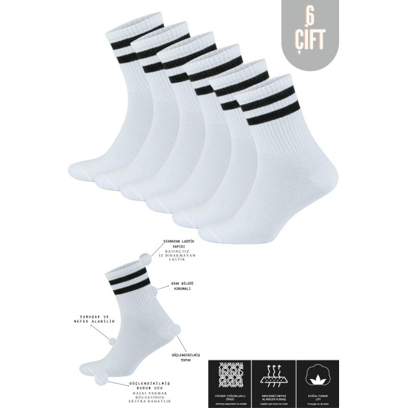 Erkek - Kadın (6 ÇİFT) Çizgili Kolej Tenis Çorabı Pamuklu Terletmez Çorap