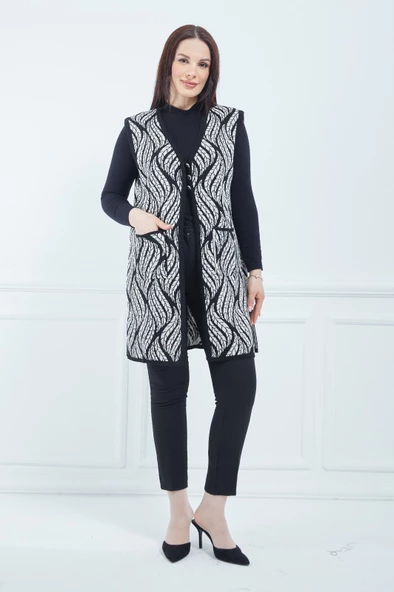 Kadın Krem Desenli Cepli Uzun Kışlık Triko Anne Yelek