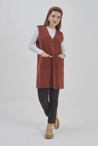 Kadın Uzun Mevsimlik Triko Likralı Esnek Cepli Düğmeli Yelek