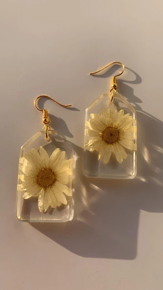 • Kurutulmuş Sarı Papatya İle Süslenmiş Kare Çerçeve Şekil Küpe Gold Aksesuarlı Epoksi El Yapımı