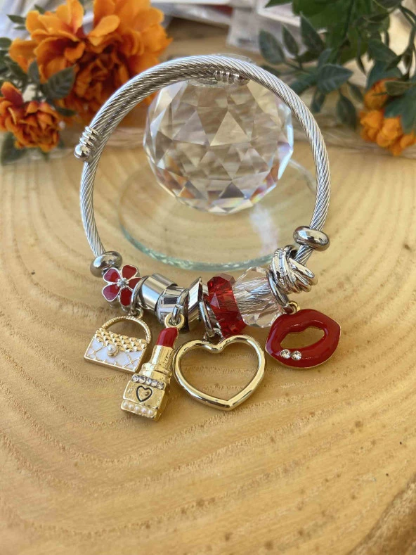 Aksesuar Çarşısı Kalp,Ruj,Dudak ve Çanta Tasarımlı Charm Bileklik