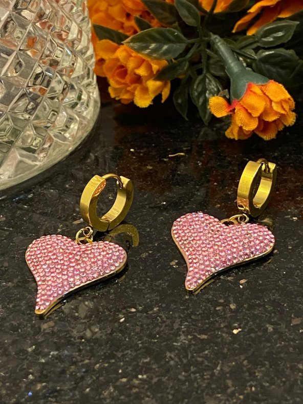 Aksesuar Çarşısı Çelik Pembe Taşlı Kalp Küpe
