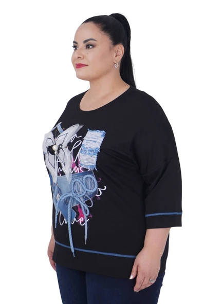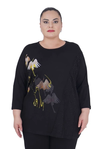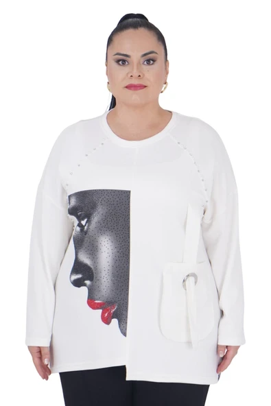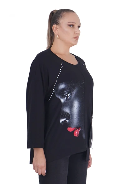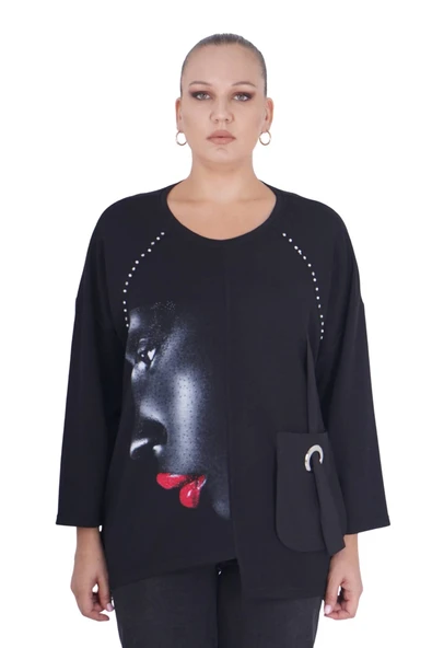 Kadın Büyük Beden Kız Figürlü Uzun Kol Asimetrik Bluz