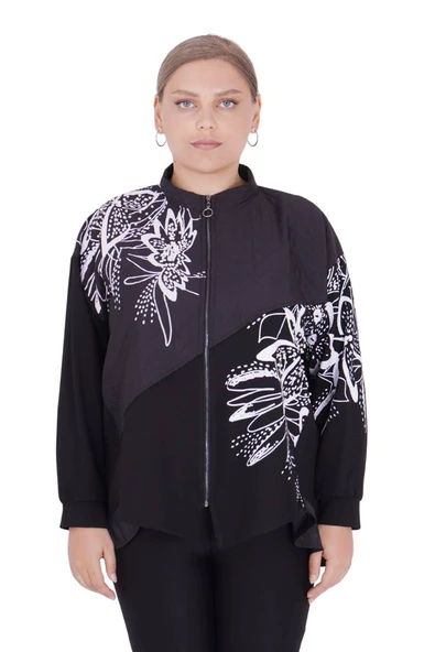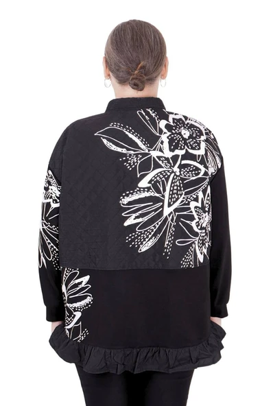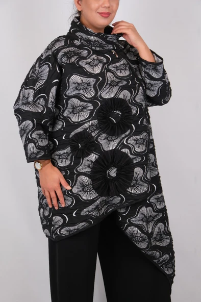 Kadın Büyük Beden Siyah Çiçek Motifli Şık Bluz