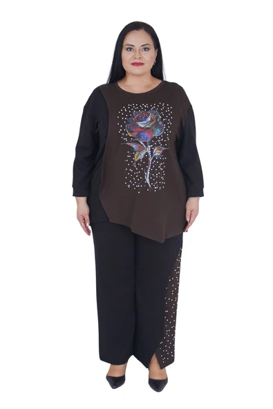 Kadın Büyük Beden İnci Detaylı Gül Baskılı Alt Üst İkili Takım