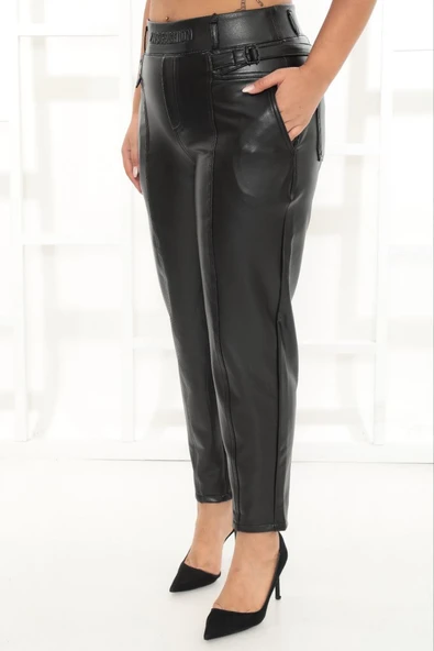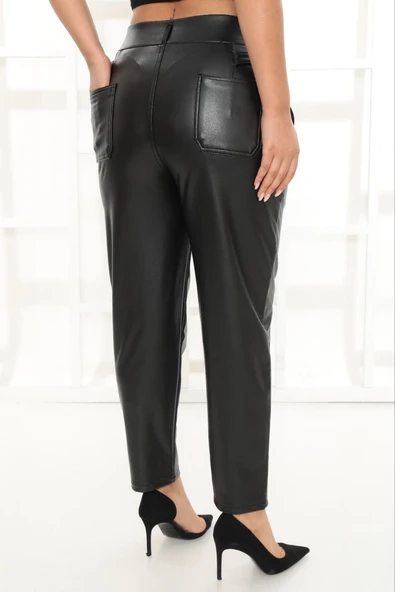 Büyük Beden Kadın Deri Görünümlü Yüksel Bel Boru Paça Pantolon