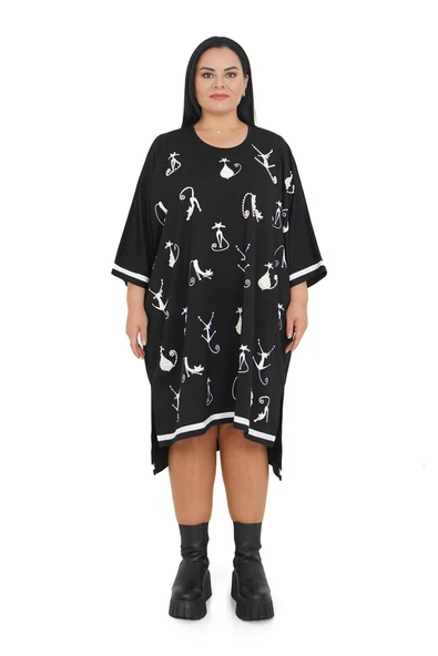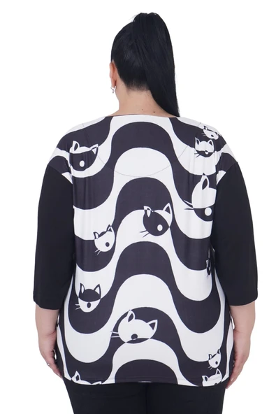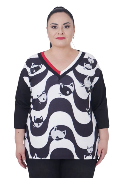 Büyük Beden Kedi Desenli V Yaka Kapri Kol Bluz