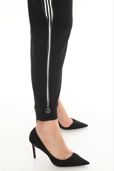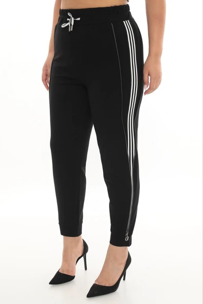 Büyük Beden Kadın Beyaz Şeritli Fermuarlı Dar Paça Jogger Pantolon
