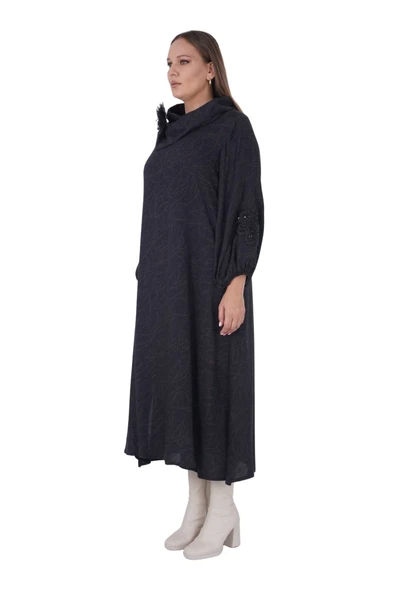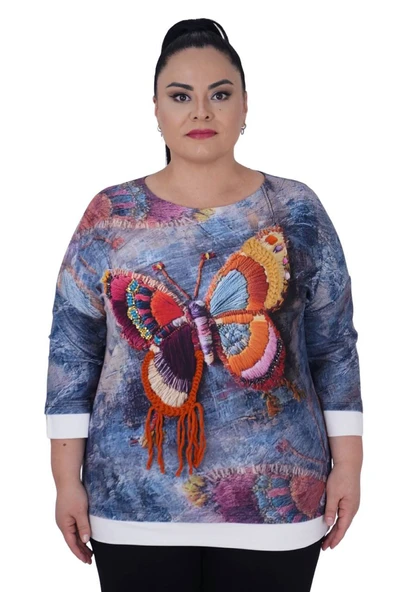 Büyük Beden Kelebek Baskılı Boncuk İşleme 3D Kışlık Bluz