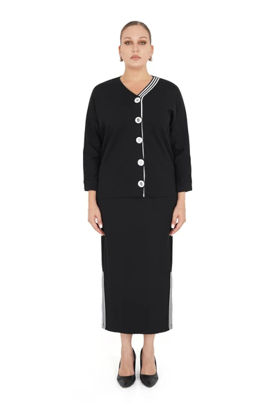 Kadın Büyük Beden Siyah Beyaz Şeritli Alt Üst İkili Etek Bluz Takım