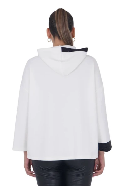 Kadın Büyük Beden Beyaz Taşlı Şık Kapüşonlu Bluz