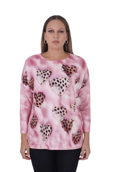 Büyük Beden Leopar Kalp Baskılı Tüğ Detay İnci İşleme Kışlık Bluz