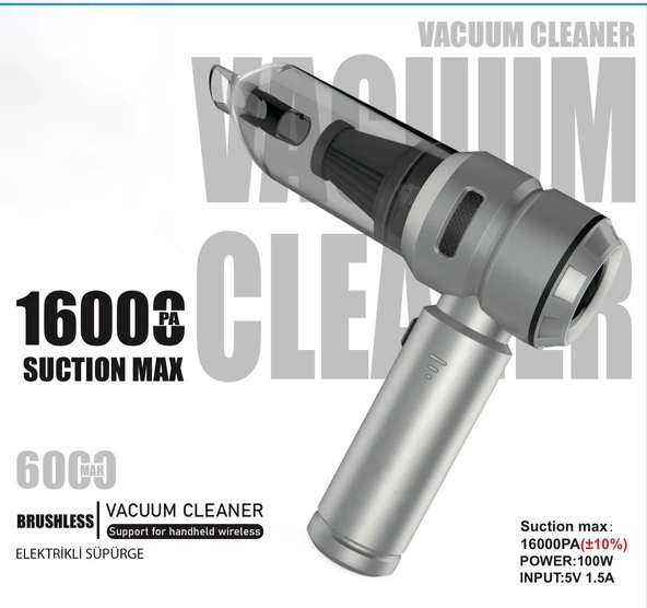 HL-135 16000pa Güçlü Portatif 3 Kademeli Tabilir Vakumlu Kablosuz Üflemeli Mini Araç Süpürgesi