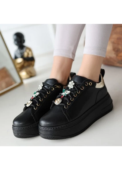 Tenya Siyah Cilt Taşlı Bağcıklı Spor Ayakkabı
