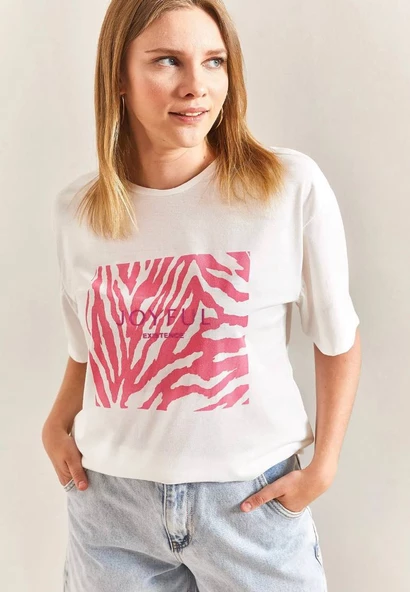 Baskılı Basic Bisiklet Yaka Örme T-Shirt Önü Pembe