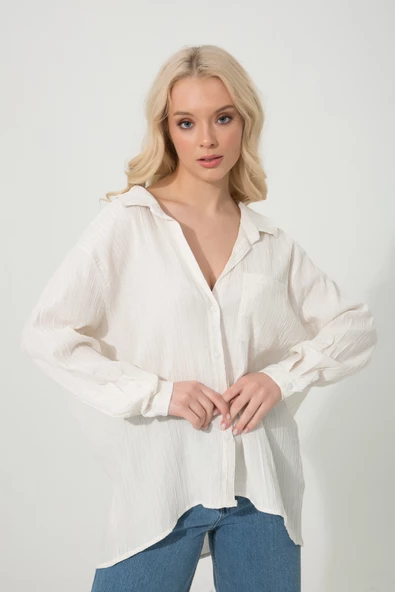 Kadın Ekru Cepli Rahat Kesim Arkası Uzun Salaş Gömlek Gömlek