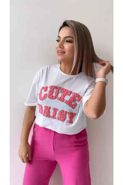 Kabartmalı Cute Daisy Tişört Ekru Pembe