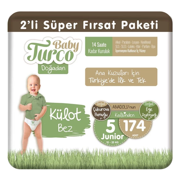 Baby Turco Doğadan 2'li Süper Fırsat Paketi Külot Bez 5 Numara Junior 174 Adet