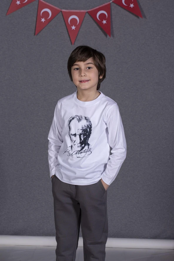 Unisex Çocuk Atatürk Baskılı Beyaz Uzun Kollu T-Shirt (4-12yaş)