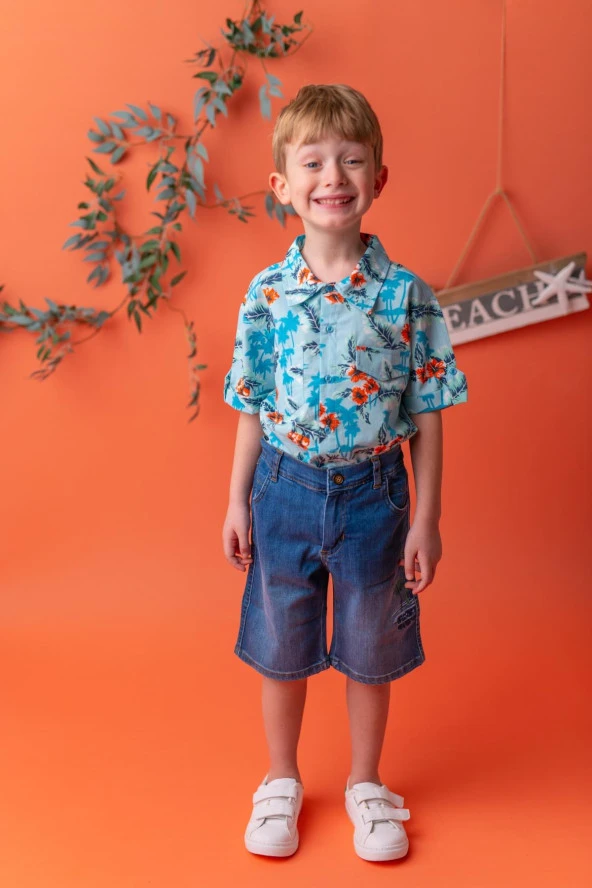 Erkek Çocuk Mavi Palmiye Nakışlı Kot Şort (5-14yaş)