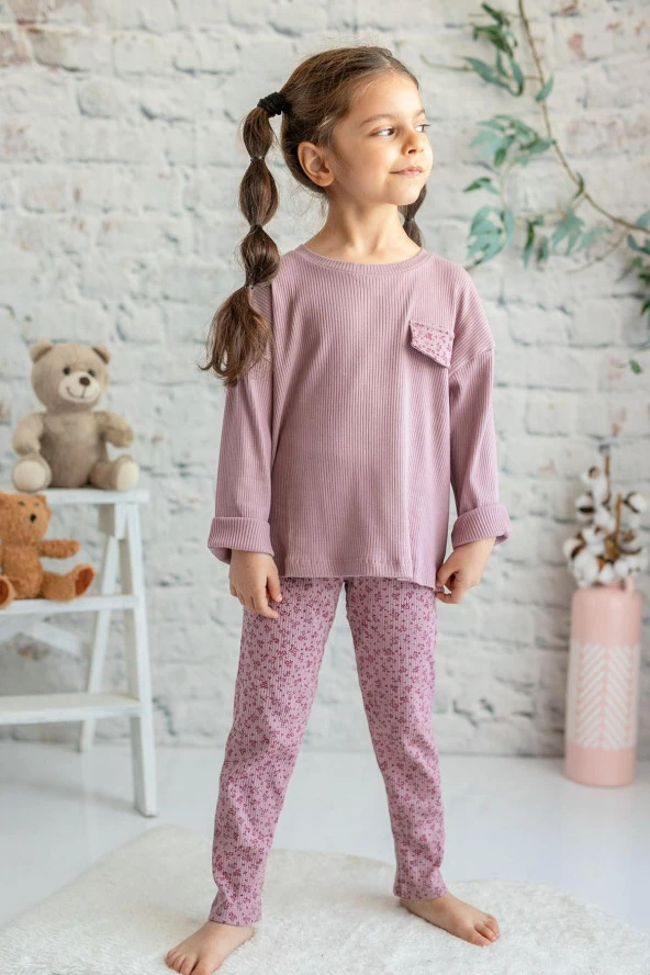 Kız Çocuk Çiçekli Cep Kapak Detaylı Bluz ve Tayt Takım (2-7yaş)