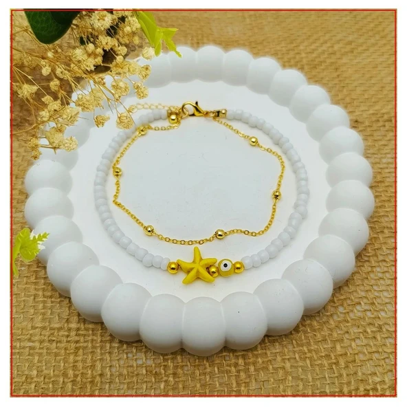 Beyaz Boncuk & Nazar Boncuğu Deniz Yıldızı Kadın Halhal