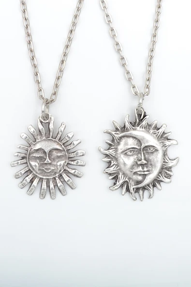 2'li Güneş ve Ay - Gülen Güneş Gümüş Kaplama Kolye Seti