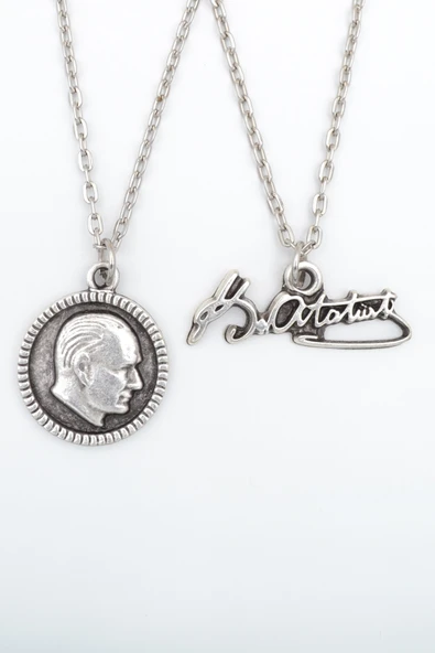 2'li Kemal Atatürk İmza - Madalyon Gümüş Kaplama Kolye Seti