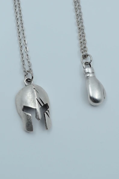 2'li Savaşçı Miğfer Boks Eldiveni Gümüş Kaplama Kolye Seti